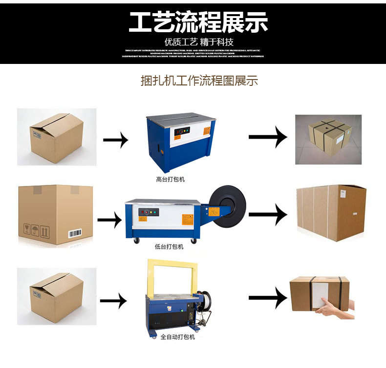 打包機是以聚乙烯塑料帶為捆扎材料,主要用于商業、郵政、鐵路、銀行、食品、醫藥、書刊發行等行業的紙箱、紙包件、柳編箱、布包件的包裝捆扎。